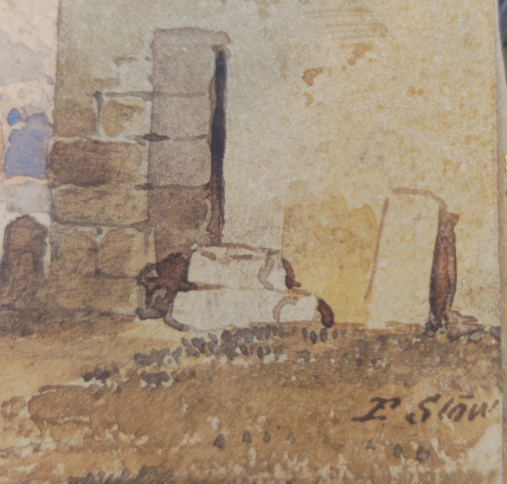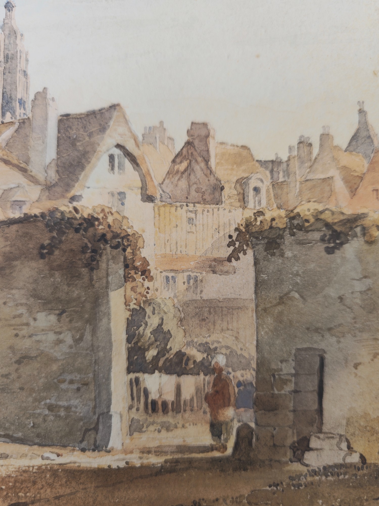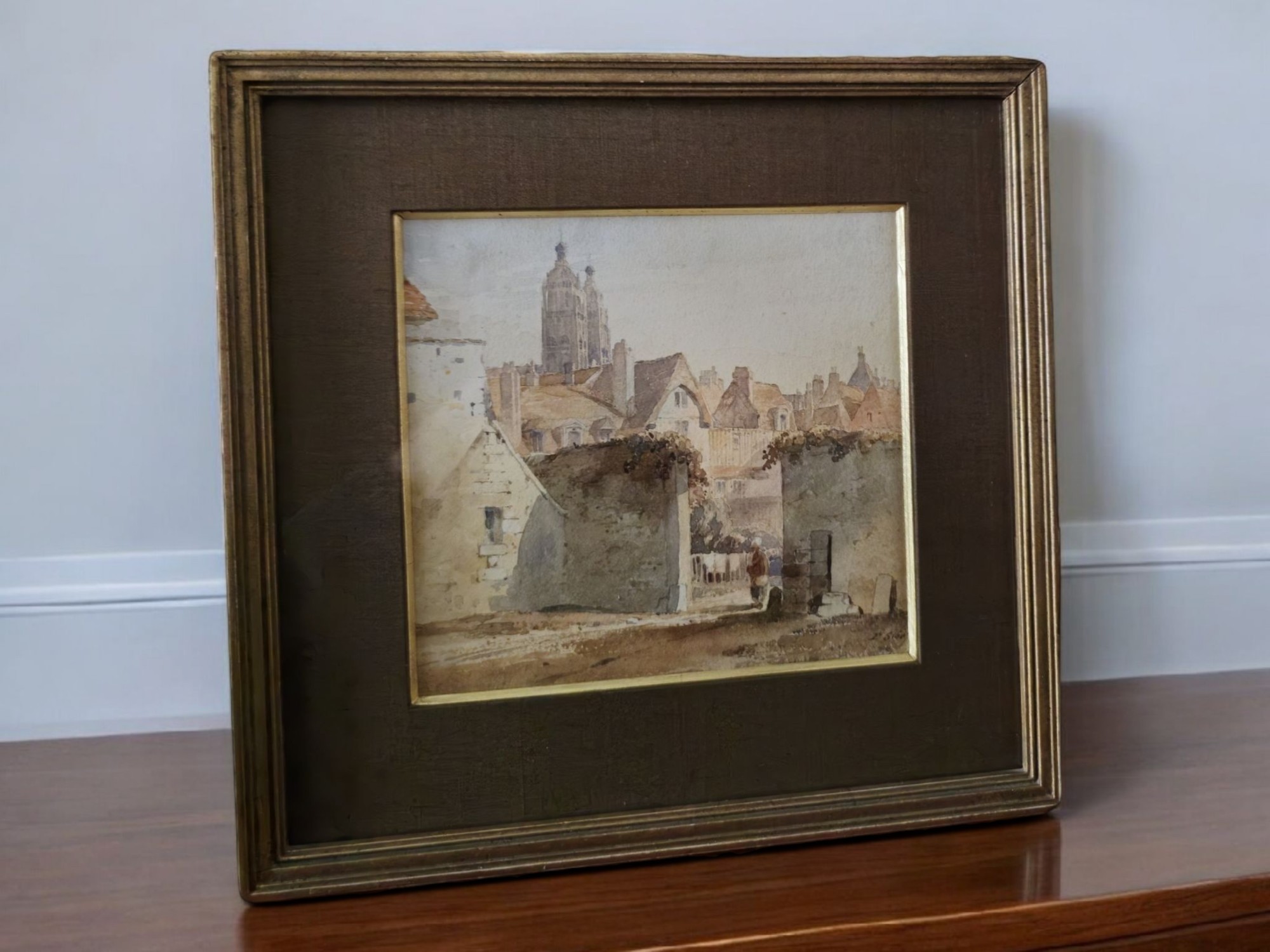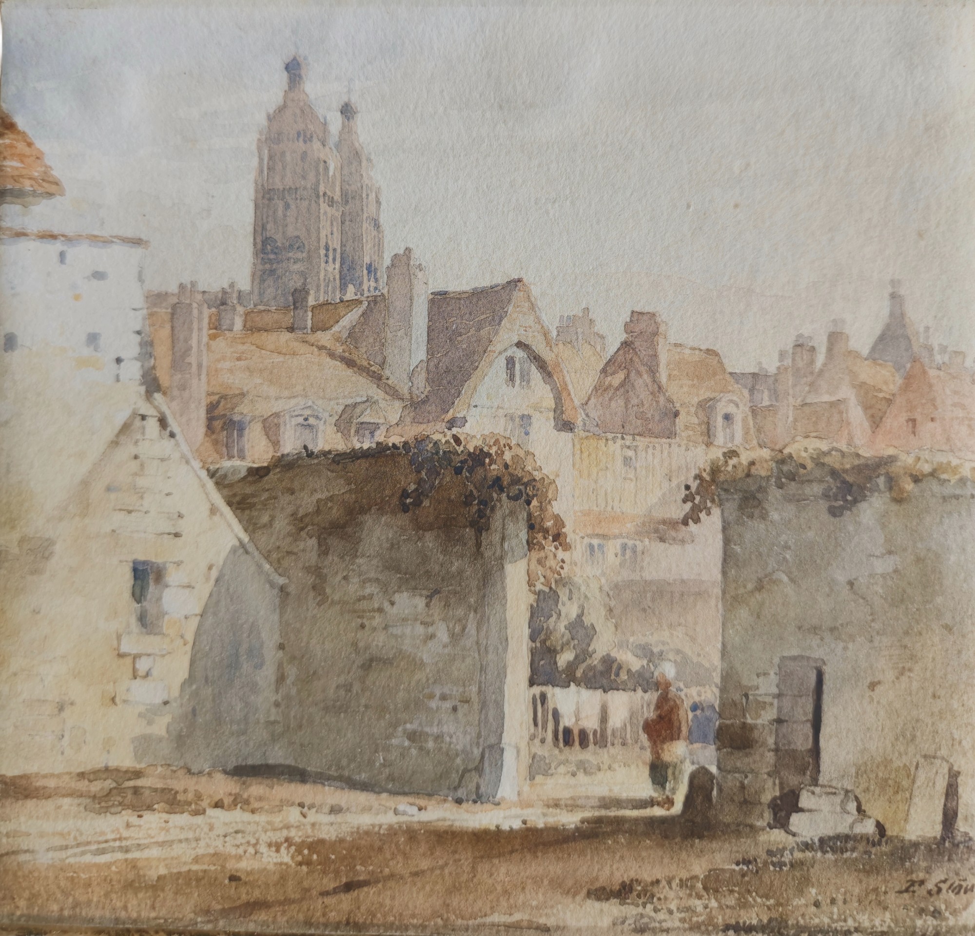 Francois Stroobant, Paysage de Tours avec la Cathédrale Saint-Gatien, s.d. Aquarelle. Signature en bas à droite mais lacunaire : F. Stroo[…].  x mm. Annoté à l’arrière « F. Stroobant ». État : Très bon état. Provenance : collection particulière belge